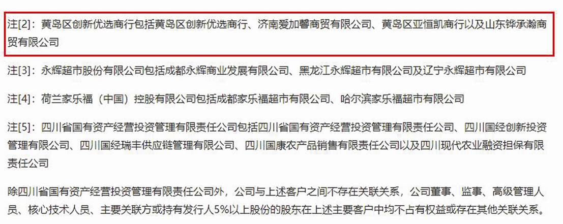 值得注意的是,記者發稿前翻閱菊樂股份最新招股書時,對比過往招股書,發現該大客戶同一控制下企業“突然”多出了2020年10月成立的山東鏵承瀚商貿有限公司(見圖二)。因為此前在菊樂股份2022年披露的招股書中,黃島區創新優選商行還只是“包括黃島區創新優選商行、濟南愛加馨商貿有限公司以及黃島區亞恒凱商行”。(見圖七)