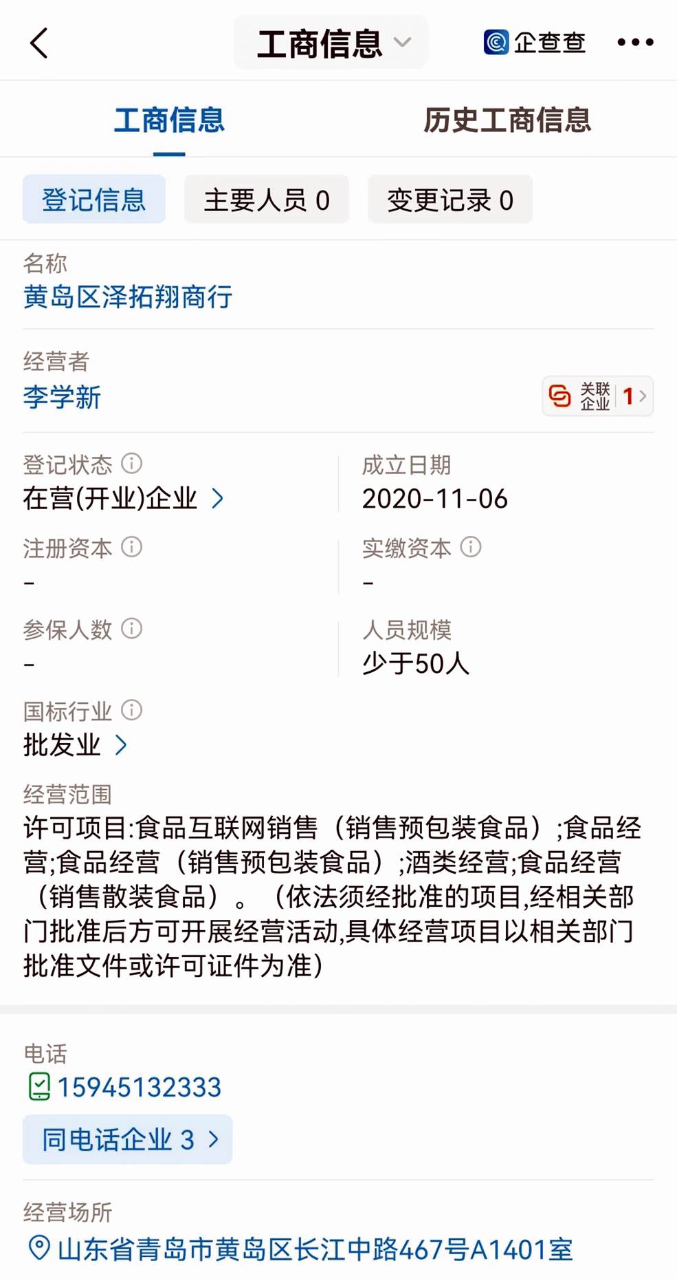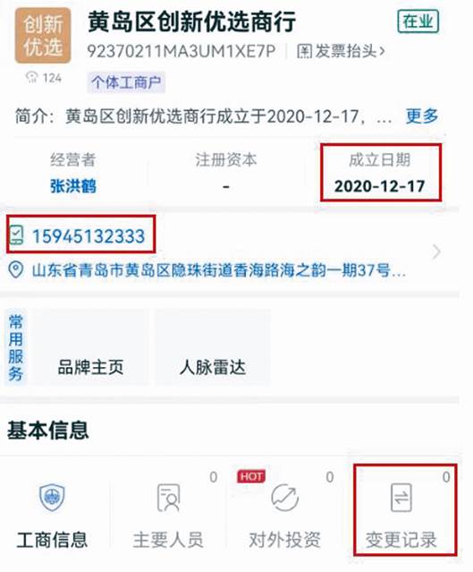 黃島區創新優選商行的成立時間頗令人側目——通過企查查查詢的工商信息顯示,黃島區創新優選商行于2020年12月17日成立,經營者為張洪鶴(見圖三)。