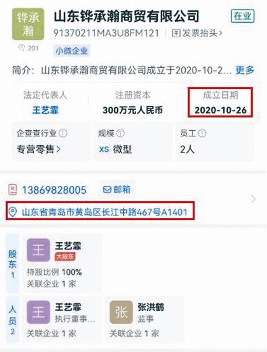 黃島區創新優選商行同一控制下的另外三家企業大部分的成立時間也都在2020年四季度。黃島區亞恒凱商行成立于2020年11月19日,經營者為白璐。山東鏵承瀚商貿有限公司成立于2020年10月26日,法定代表人、唯一股東、執行董事均為王藝霏,張洪鶴為監事(見圖四)。只有2014年4月18日成立的濟南愛加馨商貿有限公司經營時間較長,法定代表人、唯一股東、執行董事均為張加艷,楊光遠為監事。