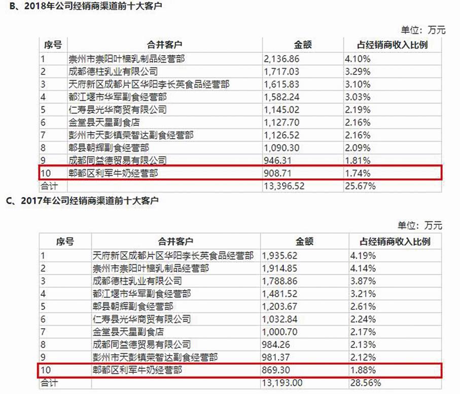 也就是說,2017年11月才成立的郫都區利軍牛奶經營部,用2個月就完成了老牌經銷商華陽經銷商鐘德金半年的銷售額,也接近了自身次年的銷售額。疑問油然而生——這是否正常?郫都區利軍牛奶經營部是否與其他老牌渠道經銷商或公司存在特殊關系,公司對于郫都區利軍牛奶經營部又是否存在未披露情形?