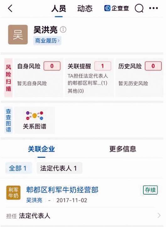 這意味著,郫都區利軍牛奶經營部的銷售能力比黃島區創新優選商行有過之而無不及——成立后用兩個月就銷售了870萬元,并以此躋身公司當年前十大經銷商渠道大客戶。通過企查查查詢的信息也直觀顯示,經營者吳洪亮無其他投資企業(見圖十)。