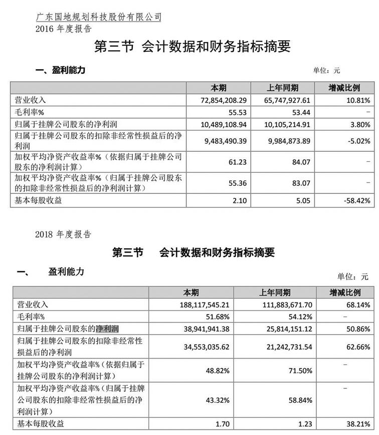 記者查詢以往業(yè)績(jī)發(fā)現(xiàn),國(guó)地科技2016年以來(lái)業(yè)績(jī)持續(xù)增長(zhǎng),但2019年之前凈利潤(rùn)遠(yuǎn)未達(dá)到5000萬(wàn)元。新三板掛牌期間年報(bào)顯示,國(guó)地科技2016-2018年凈利潤(rùn)依次為1048.91萬(wàn)元、2581.41萬(wàn)元、3894.19萬(wàn)元(見圖一)。