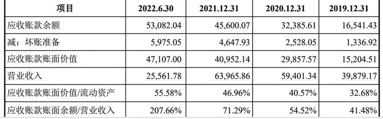 從招股書披露的數(shù)據(jù)來(lái)看,國(guó)地科技報(bào)告期內(nèi)凈利潤(rùn)持續(xù)增長(zhǎng)的背后是各期末應(yīng)收賬款余額激增。2019年末、2020年末、2021年末和2022年6月末,國(guó)地科技應(yīng)收賬款賬面余額分別為16541.43萬(wàn)元、32385.61萬(wàn)元、45600.07萬(wàn)元和53082.04萬(wàn)元,占營(yíng)業(yè)收入的比例分別為41.48%、54.52%、71.29%和207.66%(見圖二)。應(yīng)收賬款賬面價(jià)值合計(jì)占流動(dòng)資產(chǎn)的比例也逐年攀升,報(bào)告期各期末應(yīng)收賬款凈額占流動(dòng)資產(chǎn)的比例分別為32.68%、40.57%、46.96%和55.58%。公司應(yīng)收賬款賬齡主要集中在1年以內(nèi),報(bào)告期各期末,在1年以內(nèi)的應(yīng)收賬款余額占比分別為80.58%、80.72%、65.27%和65.78%。報(bào)告期各期,公司應(yīng)收賬款周轉(zhuǎn)率分別為3.12、2.43、1.64和0.52,呈下降趨勢(shì)。