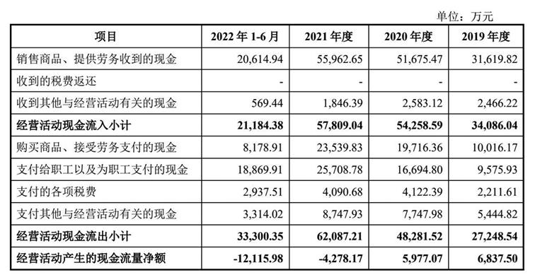 伴隨著經(jīng)營(yíng)規(guī)模擴(kuò)大,國(guó)地科技經(jīng)營(yíng)活動(dòng)現(xiàn)金流量?jī)纛~卻持續(xù)減少,尤其到了2022年上半年現(xiàn)金流量?jī)袅鞒鲇?億元。招股書顯示,2019-2022年上半年,國(guó)地科技經(jīng)營(yíng)活動(dòng)產(chǎn)生的現(xiàn)金流量?jī)纛~分別為6837.50萬(wàn)元、5977.07萬(wàn)元、-4278.17萬(wàn)元及-12115.98萬(wàn)元(見圖三),與上述持續(xù)增長(zhǎng)的凈利潤(rùn)并不完全匹配。