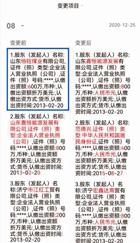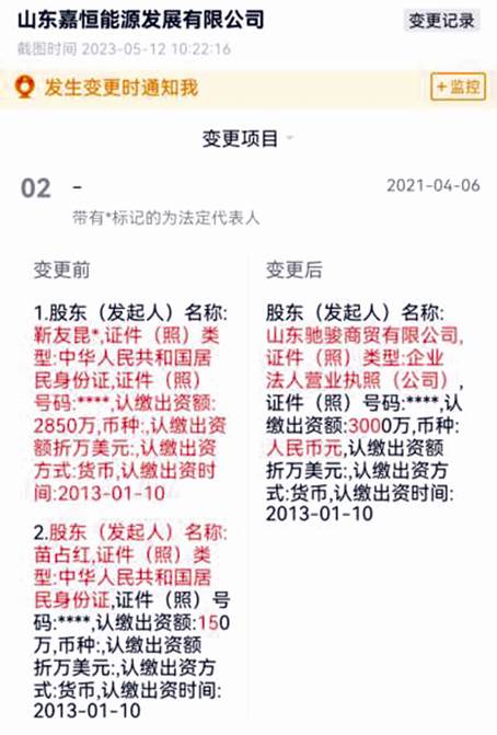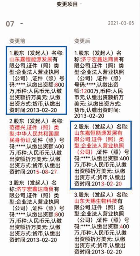 而且,金典典當歷史股東中,還有2021年10月19日退出的持股20%股東即山東嘉恒能源發展有限公司(見圖二,以下簡稱“山東嘉恒”),股權穿透后顯示,該企業也系鄭海濤間接絕對控股的企業。事實上,工商變更登記信息顯示,恒諾實業退出時,山東嘉恒持有金典典當40%股權,后在2021年3月5日持股才降至20%(見圖一、圖三)。