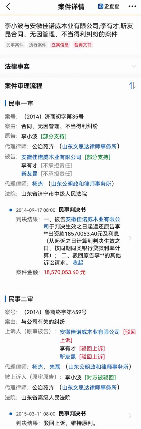 根據中國裁判文書網及企查查查詢的信息顯示,名叫李小波的人作為原告,曾起訴佳諾威有限、李有才、靳友昆,要求返還公司前身設立時其的出資款1857.01萬元及利息(案號為(2014)濟商初字第35號)。
