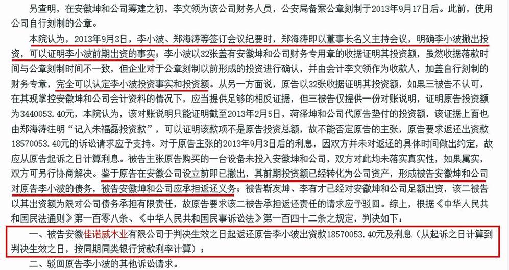 最終,濟寧中院認為,2013年9月3日,李小波和鄭海濤等簽訂會議紀要時,鄭海濤即以董事長名義主持會議,明確原告撤出投資,證明原告前期出資的事實。加上包括上述證據在內的等諸多證據可以作為認定案件事實的依據,于2014年9月17日判決佳諾威返還李小波全部出資款1857.01萬元及相關利息(見圖六)。