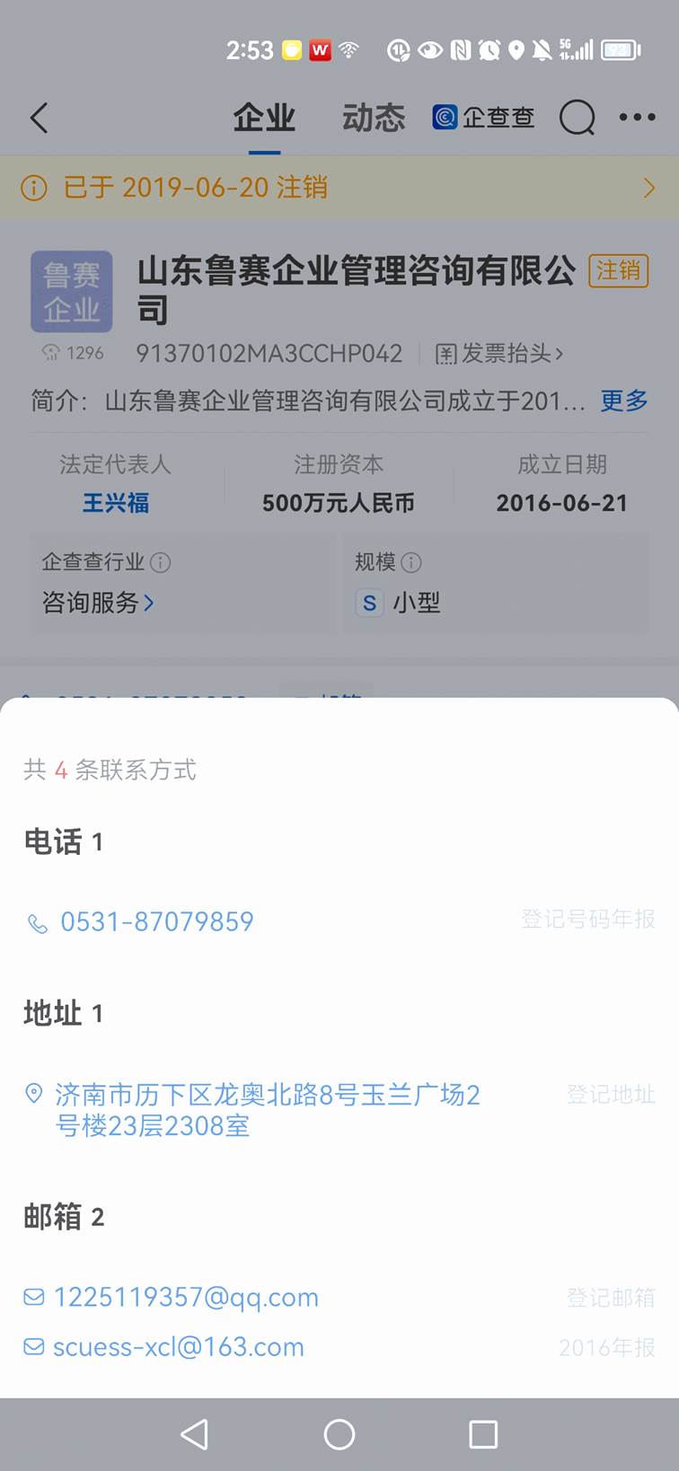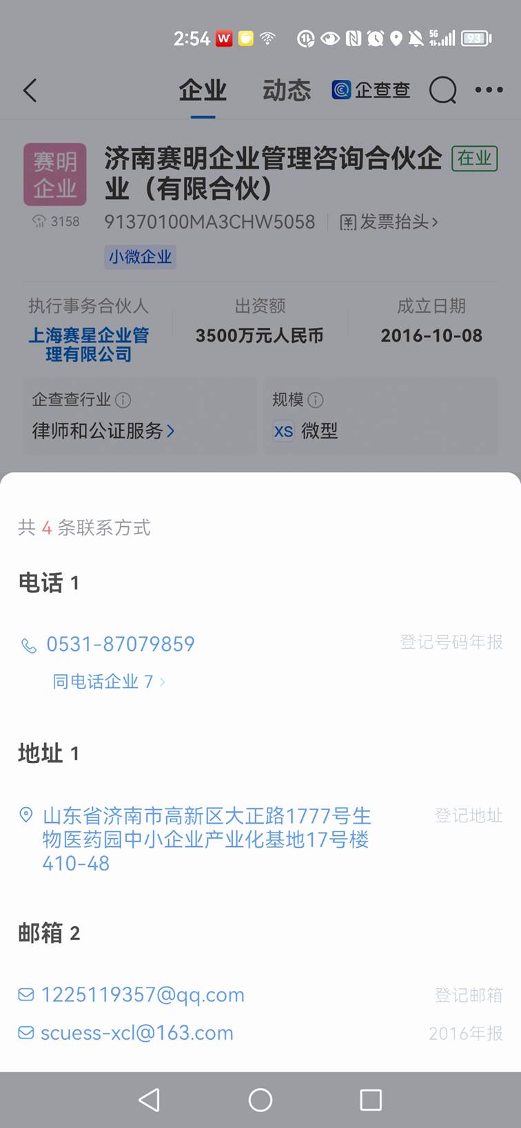 有意思的是,工商登記信息顯示,濟南賽明的登記電話為0531-87079859,登記電郵為1225119357@qq.com、scuess-xcl@ 163.com(見圖二)。