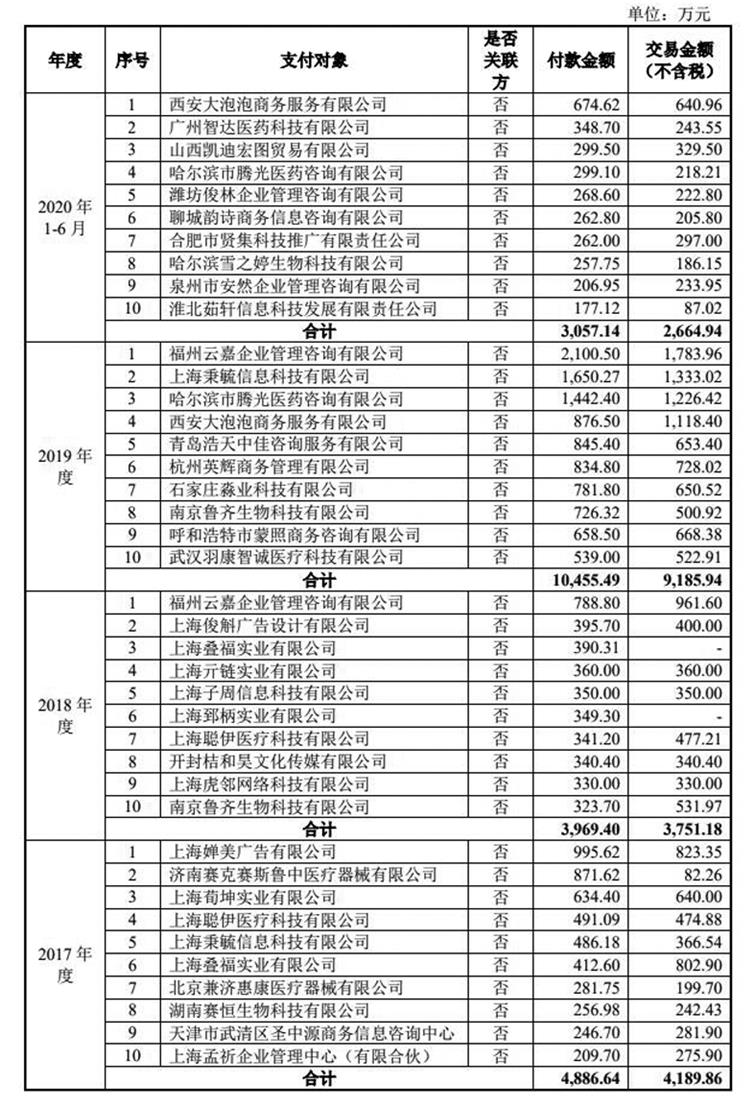 先看2017年,支付第一大推廣商上海嬋美廣告有限公司,當年付款995.62萬元,其因經營異常,2021年6月19日被吊銷;第二大推廣商濟南賽克賽斯魯中醫療器械有限公司,當年付款871.62萬元,其發起股東包括鄒方明、鄒方釗,退出時間為2019年6月;第三大推廣商上海荀坤實業有限公司,當年付款金額為634.40萬元,其經營異常,在2020年5月被吊銷;第四大推廣商上海聰伊醫療科技有限公司,付款金額為491.09萬元,其于2022年1月14日注銷;第五大推廣商上海秉毓信息科技有限公司,當年付款金額為486.18萬元,于2020年6月19日注銷;第六大推廣商上海疊福實業有限公司,當年付款金額為412.60萬元,其經營異常,于2019年6月被吊銷;第八大推廣商湖南賽恒,當年付款金額為 256.98萬元,其為公司前員工控制的核心經銷商;第九大推廣商天津市武清區圣源商務信息咨詢中心,當年付款金額為246.70萬元,其于2018年9月17日注銷。