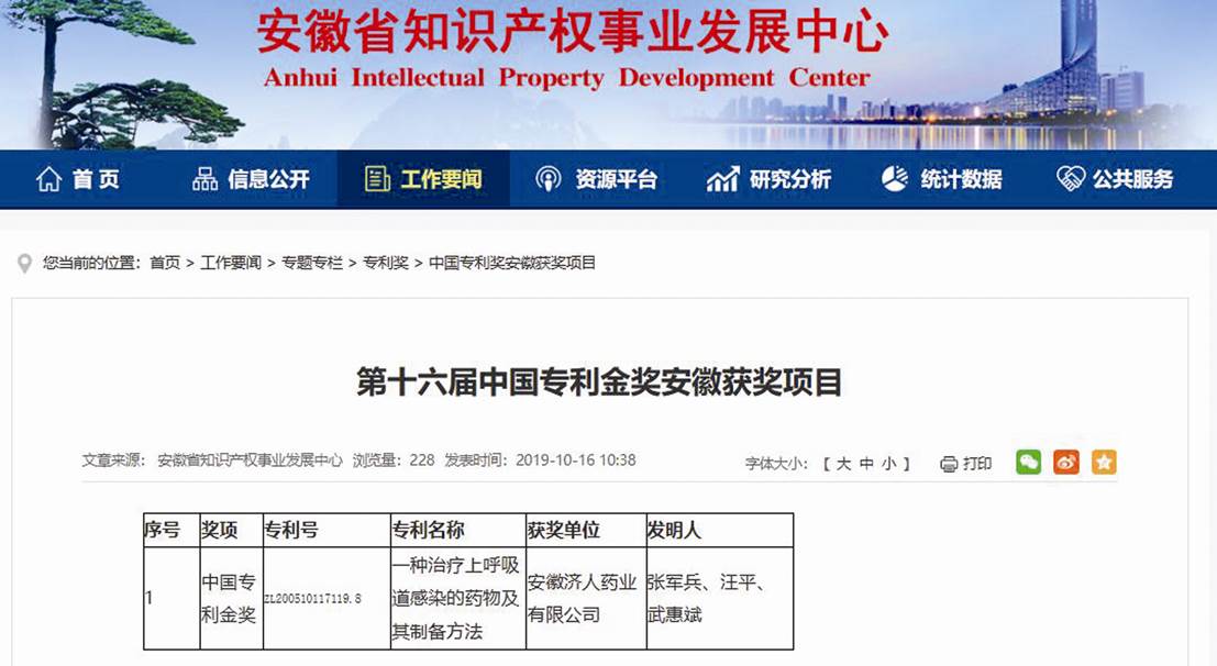 譬如,安徽省知識(shí)產(chǎn)權(quán)事業(yè)發(fā)展中心網(wǎng)站于2019年10月16日發(fā)表的《第十六屆中國(guó)專利金獎(jiǎng)安徽獲獎(jiǎng)項(xiàng)目》消息顯示,獲獎(jiǎng)單位為安徽濟(jì)人藥業(yè)有限公司(即公司前身),獲獎(jiǎng)專利名稱為“一種治療上呼吸道感染的藥物及其制備方法”,專利號(hào)為ZL200510117119.8(見(jiàn)圖一)。這充分說(shuō)明該發(fā)明專利系濟(jì)人藥業(yè)所稱的獨(dú)家專利品種疏風(fēng)解毒膠囊的核心專利。