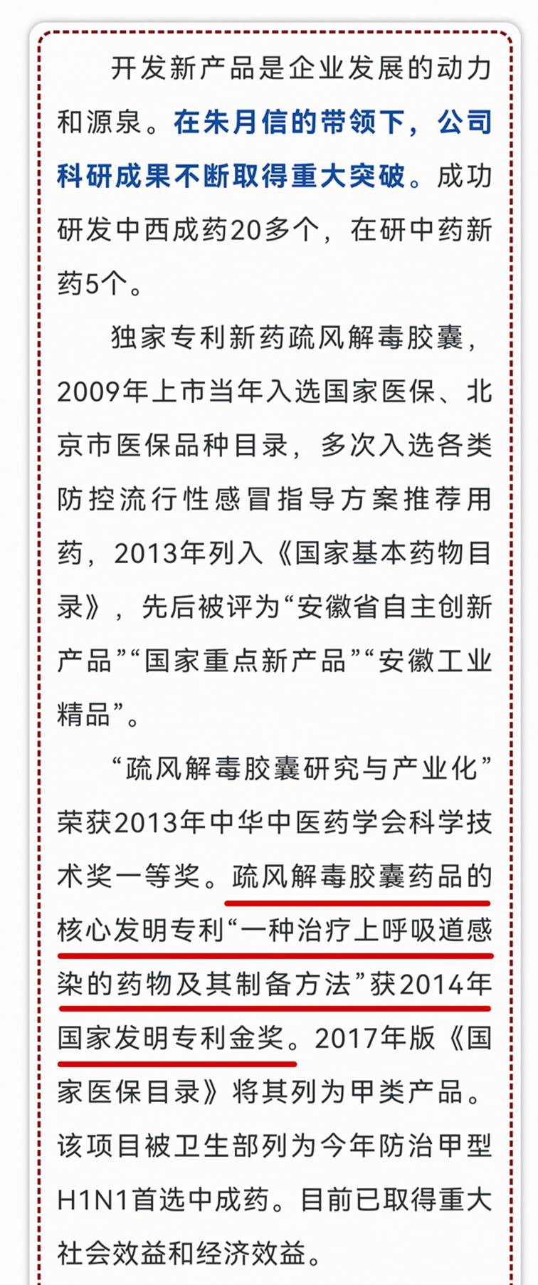 譬如,招股書(shū)中介紹——疏風(fēng)解毒膠囊為公司獨(dú)家專利品種,主要用于治療上呼吸道感染及多種病毒性疾病,系國(guó)家基本藥物目錄品種、國(guó)家醫(yī)保目錄甲類藥品,曾榮獲國(guó)家重點(diǎn)新產(chǎn)品、國(guó)家專利金獎(jiǎng)、中華中醫(yī)藥學(xué)會(huì)科學(xué)技術(shù)獎(jiǎng)一等獎(jiǎng)、安徽省科學(xué)技術(shù)獎(jiǎng)一等獎(jiǎng)等榮譽(yù)。