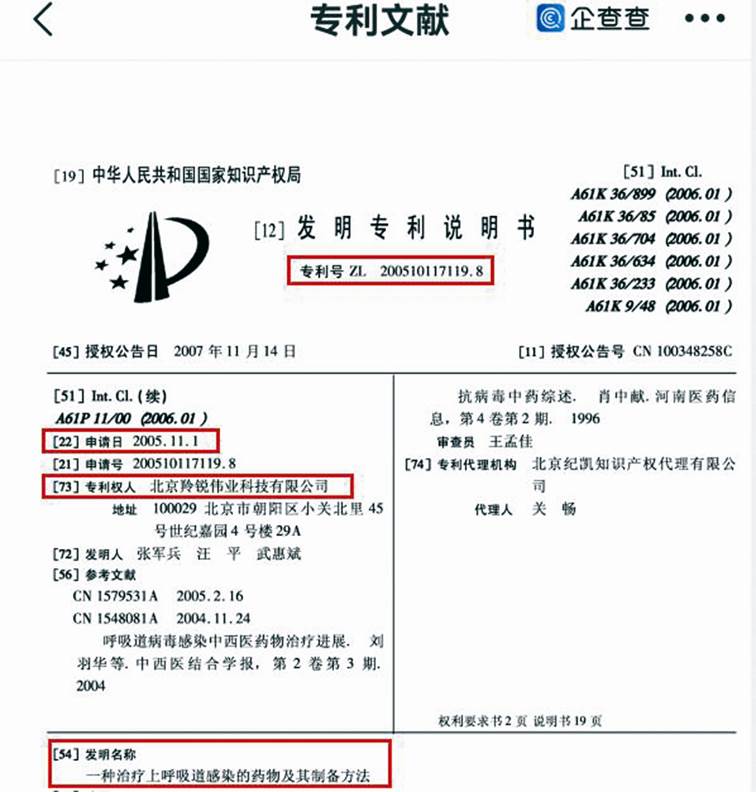 通過(guò)中國(guó)知識(shí)產(chǎn)權(quán)查詢系統(tǒng)的查詢顯示,該發(fā)明專利說(shuō)明書(shū)中的摘要為:“本發(fā)明公開(kāi)了一種治療上呼吸道感染的藥物及其制備方法。本發(fā)明治療上呼吸道感染的藥物,它的原料配方由下述重量份數(shù)比的組分組成:虎杖4-6份,連翹3-5份,板蘭根3-5份,柴胡3-5份,敗醬草3-5份,馬鞭草3-5份,蘆根2-4份,甘草1-3份。本發(fā)明能夠改善局部組織細(xì)胞缺血、缺氧,改善微循環(huán),對(duì)傷風(fēng)、急性扁桃體炎、急性咽喉炎、急性腮腺炎等上呼吸道感染所致的疾病具有顯著療效。在用本藥治療的5000多個(gè)風(fēng)熱癥病例中,總有效率達(dá)100%,痊愈率達(dá)98%,且無(wú)毒副作用。該藥具有服用方便,生產(chǎn)成本低廉的優(yōu)點(diǎn),便于推廣應(yīng)用。”權(quán)利要求書(shū)中進(jìn)一步詳細(xì)介紹了如何制備藥物。