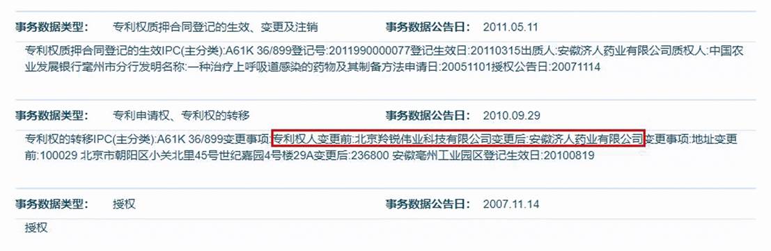 進(jìn)一步查詢可見(jiàn),2007年11月14日,該發(fā)明專利獲授權(quán);2010年9月29日出現(xiàn)專利申請(qǐng)權(quán)、專利權(quán)的轉(zhuǎn)移,受讓方為濟(jì)人藥業(yè)前身安徽濟(jì)人藥業(yè)有限公司(見(jiàn)圖五)。
