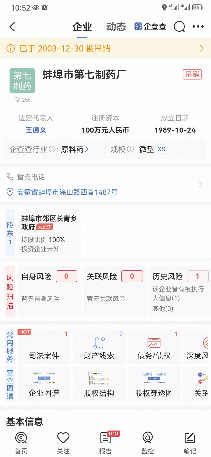企查查信息顯示,1989年10月成立、性質為集體所有制的蚌埠第七制藥廠,于2003年12月30日被吊銷,但目前未注銷(見圖三)。