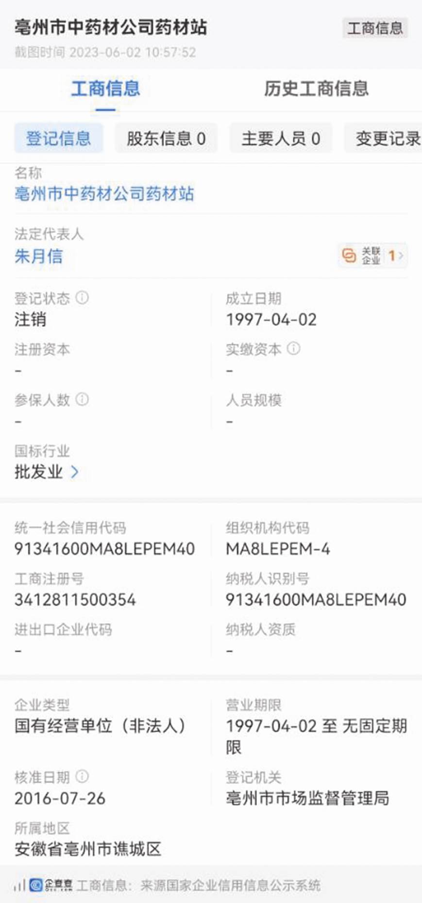 進一步查詢顯示,1997年4月2日成立、2016年7月26日注銷的亳州市中藥材公司藥材站,法定代表人也叫朱月信。工商信息更顯示,該企業性質為國有非法人經營單位(見圖四),即無獨立法人資格的國有經營單位。事實上,該企業為亳州地方國企亳州市中藥材公司的分支機構。以此來看,這位朱月信應當是亳州市中藥材公司的員工,擔任了亳州市中藥材公司藥材站的法定代表人。而且該藥材站沒有發生過工商變更登記。