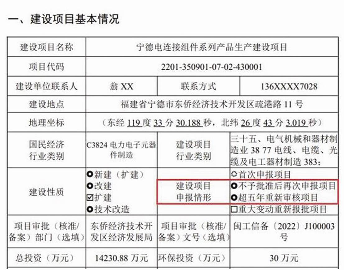 另外,寧德電連接組件系列產(chǎn)品生產(chǎn)建設(shè)項(xiàng)目的環(huán)評(píng)報(bào)告顯示,系不予批準(zhǔn)后再次申報(bào)項(xiàng)目和超五年重新審核項(xiàng)目,之前不予批準(zhǔn)的原因是什么?公司五年后重新將該項(xiàng)目進(jìn)行申報(bào)并作為IPO募投項(xiàng)目的原因是什么?