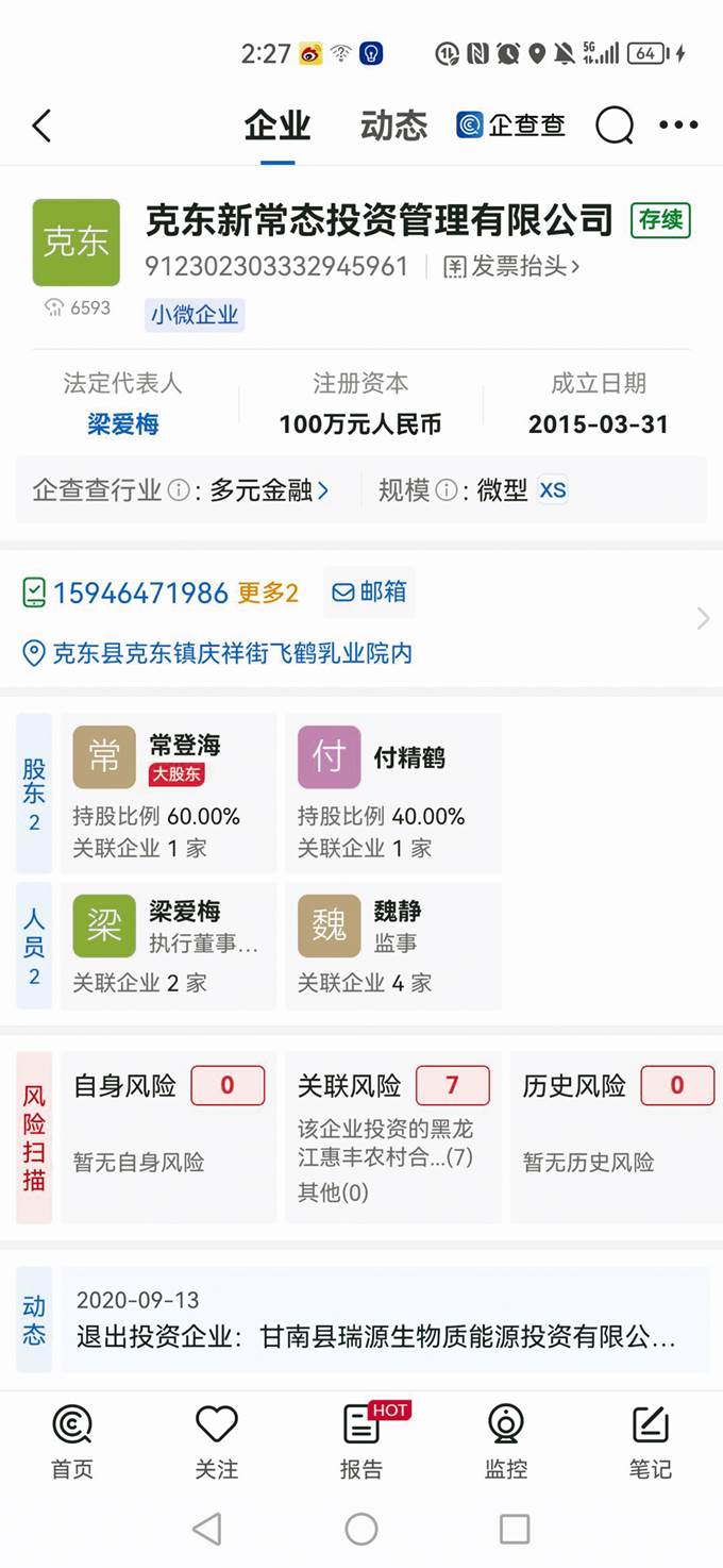 三、從企查查查詢的工商信息以及公開報道來看,除了梁愛梅,克東新常豐態的監事系飛鶴全資子公司法定代表人,以上種種顯示克東新常態與飛鶴關系不一般,其是否是飛鶴實際控制的企業?