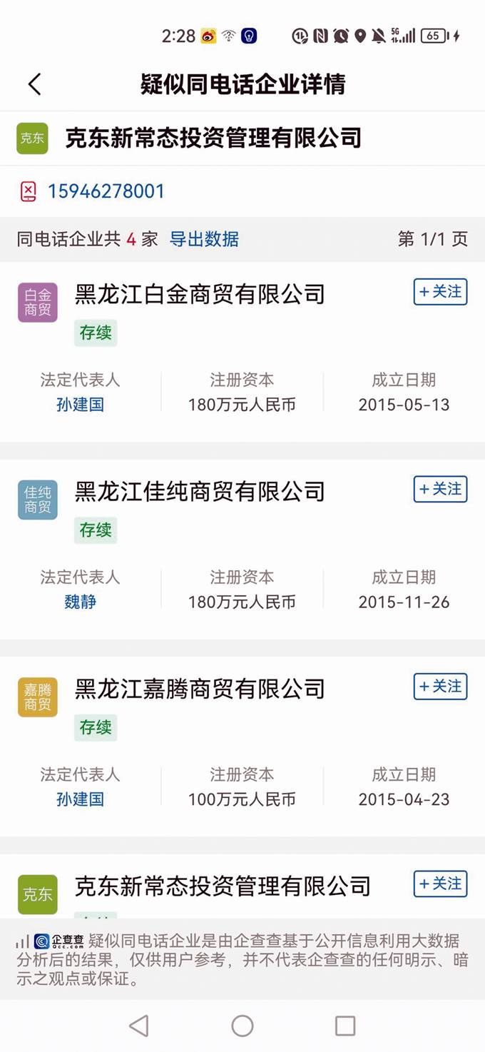 還有,克東新常態與黑龍江佳純的電話均為15946278001(見圖二),同時,克東新常態的監事魏靜系上述黑龍江佳純的法定代表人。