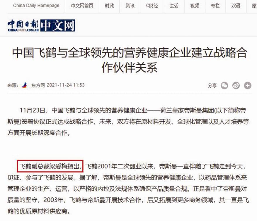 還有,中國日報中文網2021年11月24日刊登的文章《中國飛鶴與全球領先的營養健康企業建立戰略合作伙伴關系》,文中也顯示飛鶴副總裁叫梁愛梅(見圖四)。