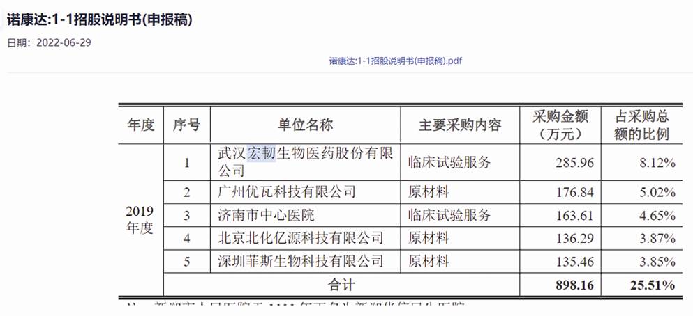 2019-2022年,武漢宏韌生物醫藥股份有限公司(以下簡稱“宏韌醫藥”)一直穩居諾康達前五大供應商,該供應商也曾經IPO,但諾康達招股書披露的2019年交易數據與宏韌醫藥招股書數據相差逾100多萬元。