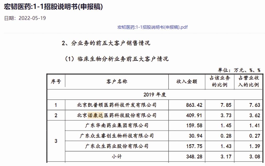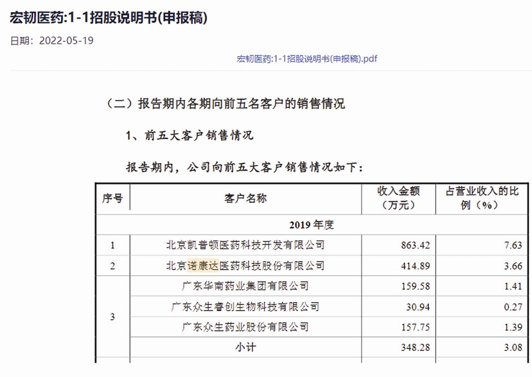 而這一交易數據在宏韌醫藥招股書中卻是400多萬元。宏韌醫藥2022年5月披露的招股書中向前五大客戶銷售情況顯示,2019年,宏韌醫藥對諾康達銷售收入金額414.89萬元(見圖三)。