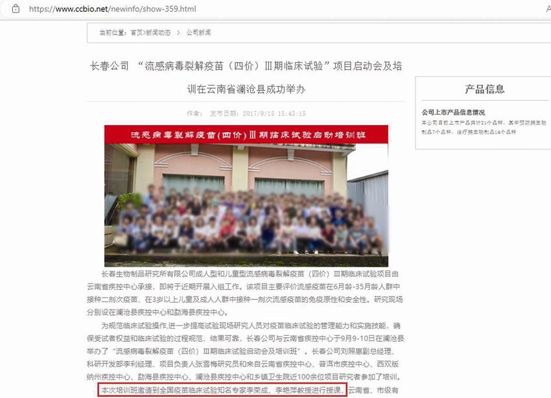 譬如,長春生物制品研究所有限責任公司官網2017年9月15日發布的《長春公司 “流感病毒裂解疫苗(四價)Ⅲ期臨床試驗”項目啟動會及培訓在云南省瀾滄縣成功舉辦》一文顯示,“本次培訓班邀請到全國疫苗臨床試驗知名專家李榮成、李艷萍教授進行授課”。(見圖一)