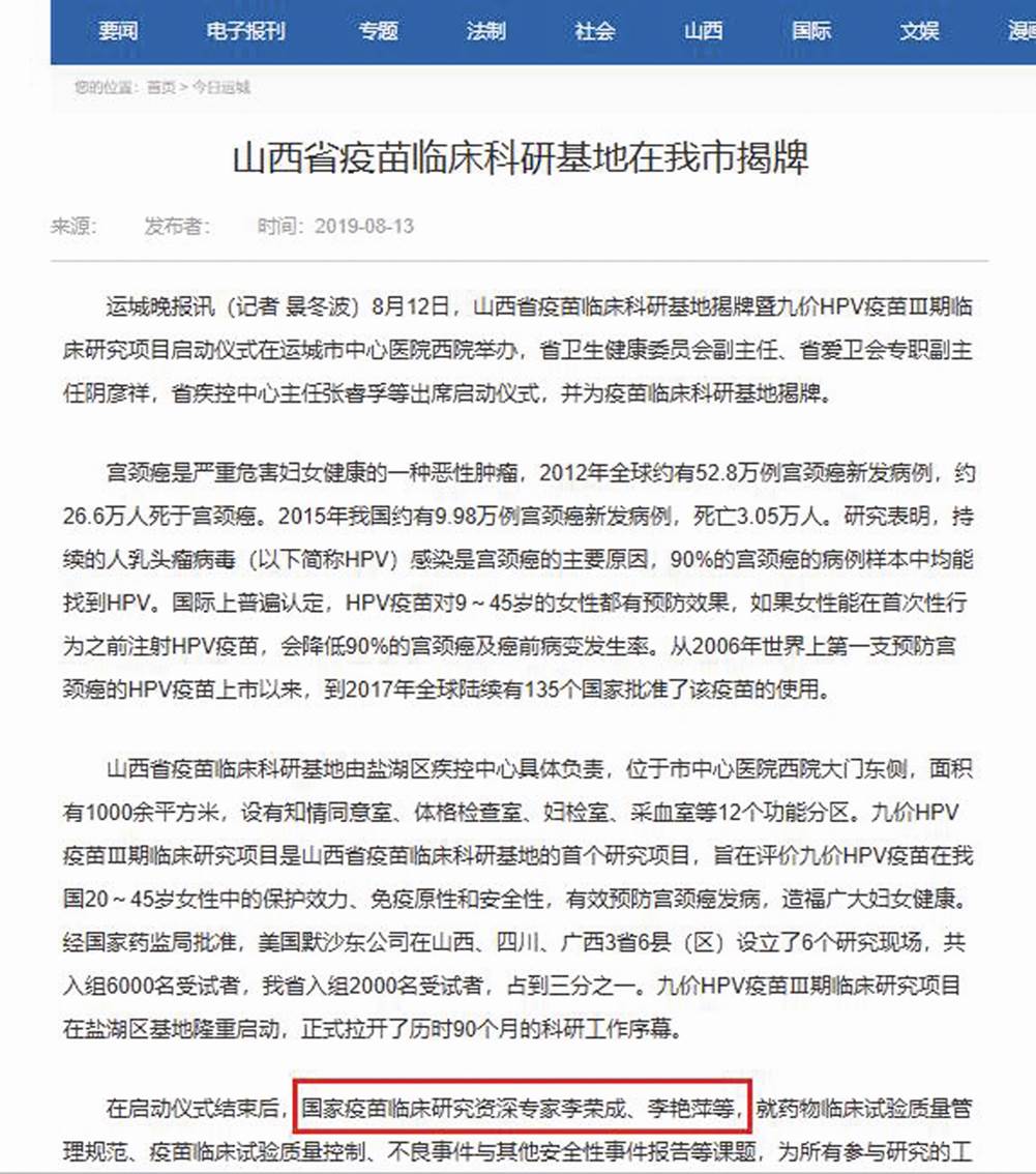 再如,運城新聞網于2019年8月13日發布的《山西省疫苗臨床科研基地在我市揭牌》一文顯示,“在啟動儀式結束后,國家疫苗臨床研究資深專家李榮成、李艷萍等,就藥物臨床試驗質量管理規范、疫苗臨床試驗質量控制、不良事件與其他安全性事件報告等課題,為所有參與研究的工作人員進行了培訓。”(見圖二)