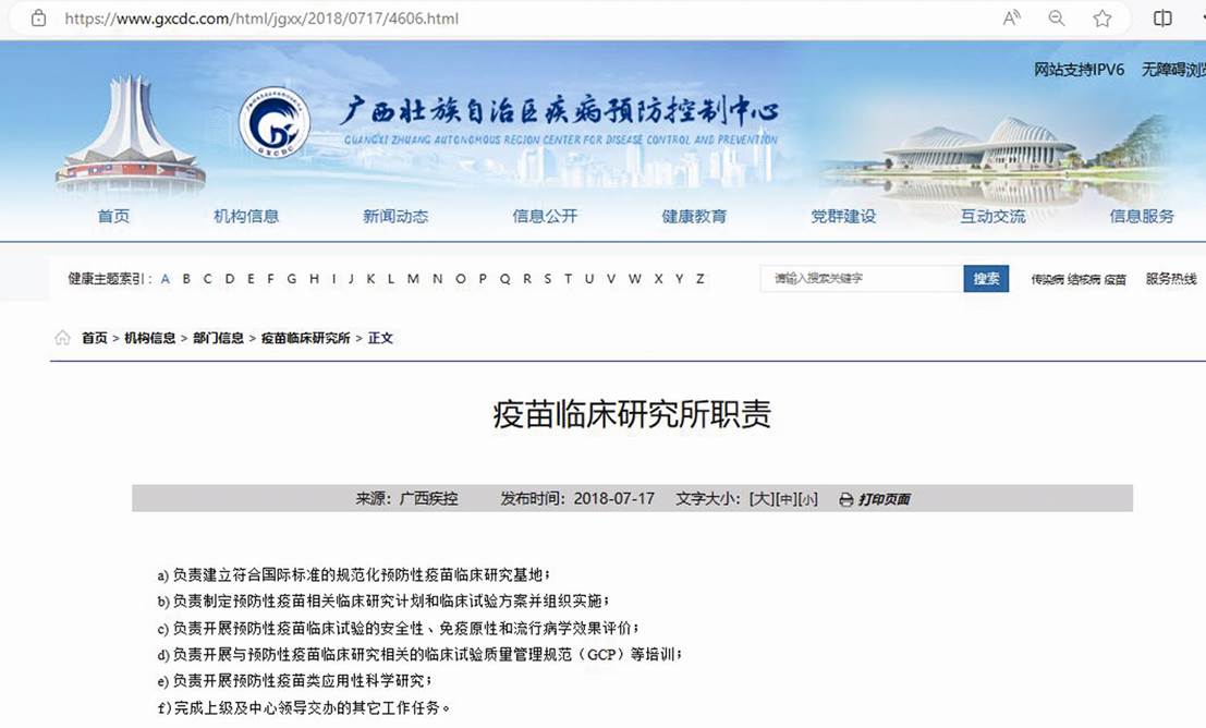 記者還登錄廣西壯族自治區疾病預防控制中心官網,發現其組織機構中包括疫苗臨床研究所,該所職責包括臨床試驗相關研究、管理等(見圖三)。