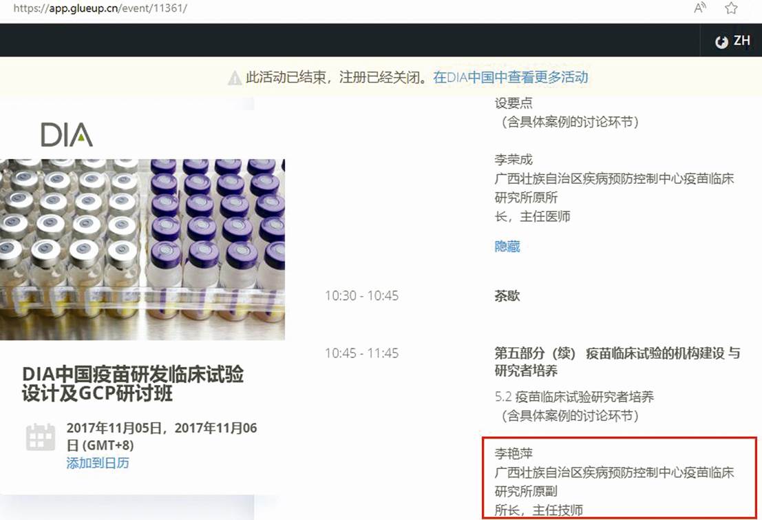 DIA中國官網的DIA中國疫苗研發臨床試驗設計及GCP研討班2017年11月開課的報名信息顯示,該屆研討班的日程安排中,第二天第五部分包括疫苗臨床試驗研究者培養(含案例討論),該環節專家為李艷萍,且赫然介紹系廣西疾控中心疫苗臨床研究所原副所長(見圖一)。