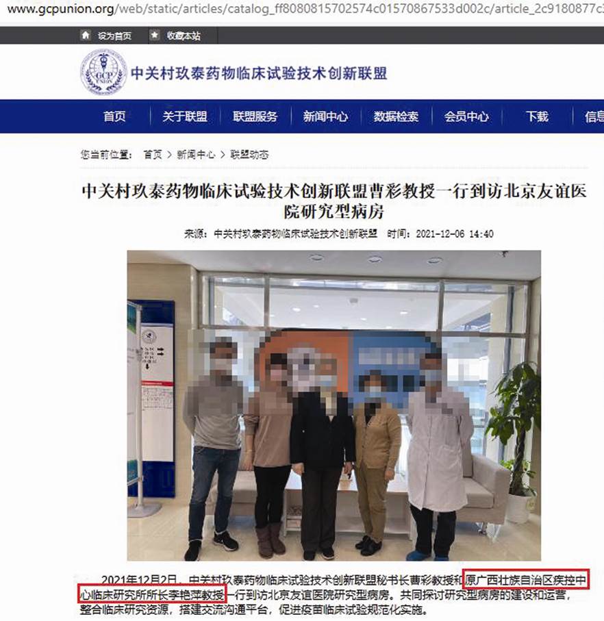 來自中關村玖泰藥物臨床試驗技術創新聯盟網站文章的李艷萍介紹同樣值得注意。其2021年12月6日發布的《中關村玖泰藥物臨床試驗技術創新聯盟曹彩教授一行到訪北京友誼醫院研究型病房》一文明確寫道:“2021年12月2日,中關村玖泰藥物臨床試驗技術創新聯盟秘書長曹彩教授和原廣西壯族自治區疾控中心臨床研究所所長李艷萍教授一行到訪北京友誼醫院研究型病房。共同探討研究型病房的建設和運營,整合臨床研究資源,搭建交流溝通平臺,促進疫苗臨床試驗規范化實施。北京友誼醫院研究型病房主任董瑞華博士對曹彩教授和李艷萍教授的到訪表示熱烈的歡迎。李艷萍教授就疫苗臨床試驗有關內容進行了詳細介紹,包括:各個階段注意事項、特點、各方角色、隨機化和盲態維持、試驗疫苗接種和管理、嚴重不良事件報告和處理等。”(見圖二)