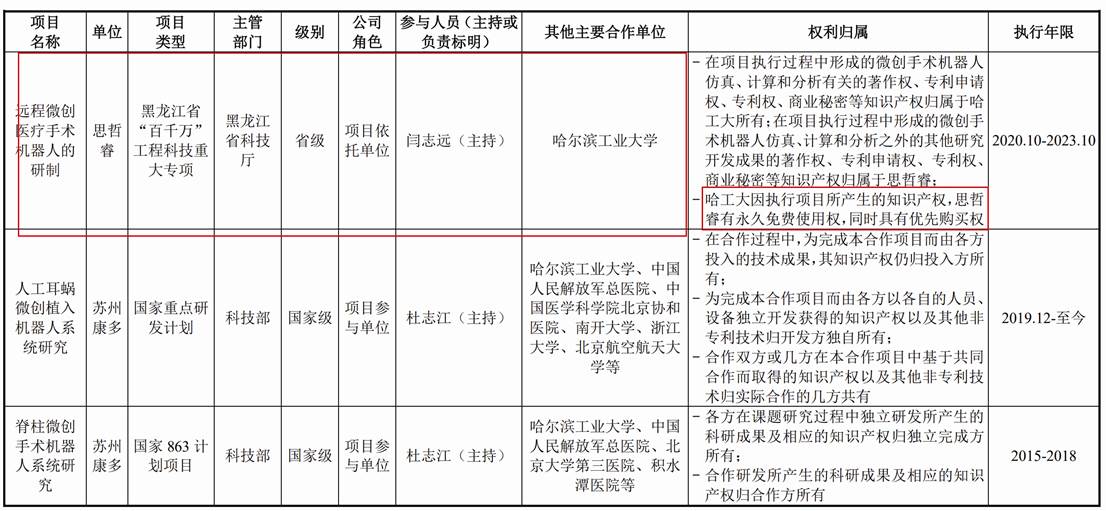 核心技術人員在哈工大、思哲睿兩份工作一肩挑,兩家單位研究成果互相交疊,難免容易讓人關注合作科研成果的歸屬界定是否存在難以厘清的情形。以思哲睿與哈工大合作的《遠程微創醫療手術機器人的研制項目》為例——該項目開始時期為2020年10月,合作研發各方以國家撥款專項經費及自籌經費投入。而招股書披露的權利歸屬上顯示,在該項目執行過程中形成的微創手術機器人仿真、計算和分析有關的著作權、專利申請權、專利權、商業秘密等知識產權歸屬于哈工大所有;在項目執行過程中形成的微創手術機器人仿真、計算和分析之外的其他研究開發成果的著作權、專利申請權、專利權、 商業秘密等知識產權歸屬于思哲睿。
