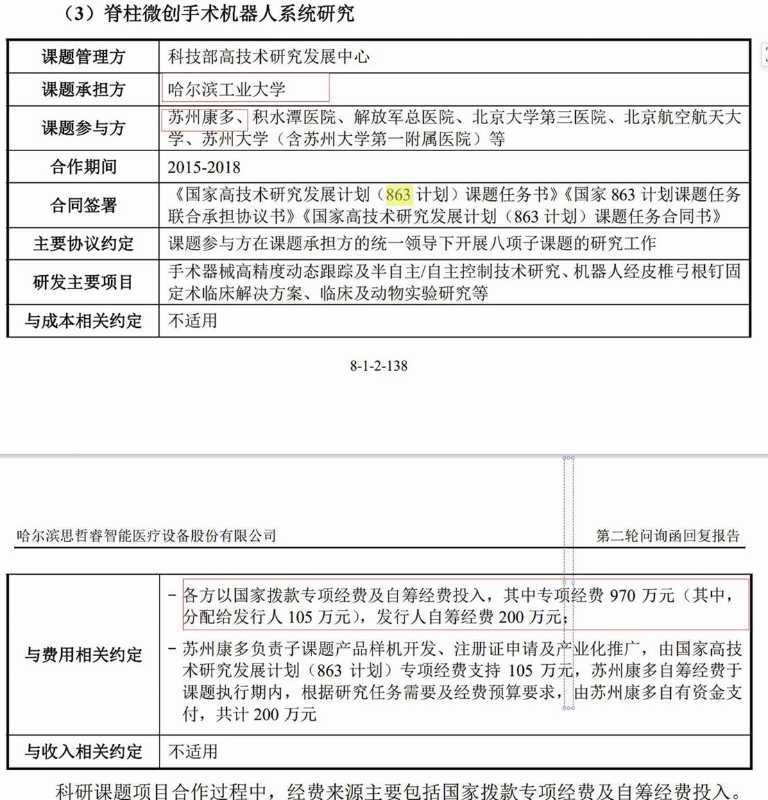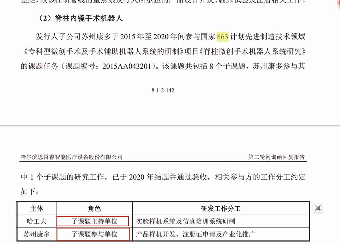 思哲睿在回復上交所問詢時表示,該課題共包括8個子課題,蘇州康多參與其 中1個子課題的研究工作,而哈爾濱工業大學是該子課題的主持單位,相關課題的分工顯示:哈工大負責實驗樣機系統及仿真培訓系統研制,蘇州康多負責產品樣機開發、注冊證申請及產業化推廣(見圖三)。