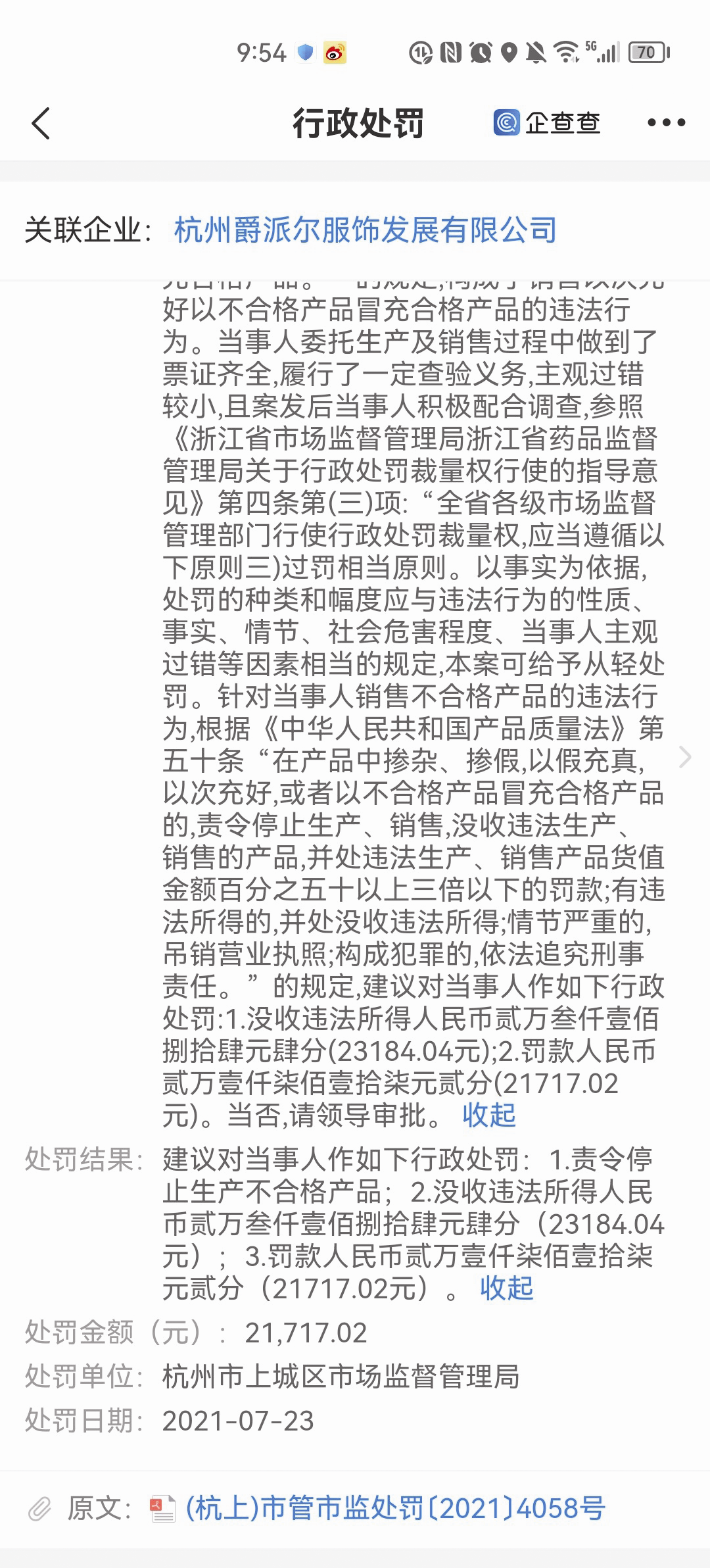 通過企查查查詢的信息顯示,浙江爵派爾控制的杭州爵派爾服飾發展有限公司因銷售不合格產品冒充合格產品,2021年被處以2.32萬元的罰款(見圖五)。