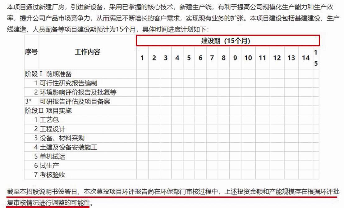 恒業微晶2022年12月招股書中,還披露了募投項目的具體時間進度計劃(見圖一),從進度計劃看,公司拿到環評批復后,募投項目才會開建。同時,公司2022年12月招股書披露該項目存在三廢排放,以及新建項目建成投產后環境影響及應對措施,并顯示——“截至本招股說明書簽署日,本次募投項目環評報告尚在環保部門審核過程中,上述投資金額和產能規模存在根據環評批復審核情況進行調整的可能性?!?/p>