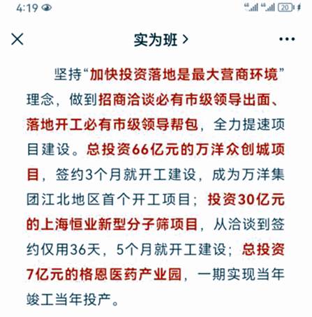認證主體為中共平度市委辦公室的微信公眾號“實為班”2021年12月7日發布的《@平度:工業挺起“全面突破”的硬脊梁》一文中,明確稱“投資30億元的上海恒業新型分子篩項目,從洽談到簽約僅用36天,5個月就開工建設?!?見圖三)
