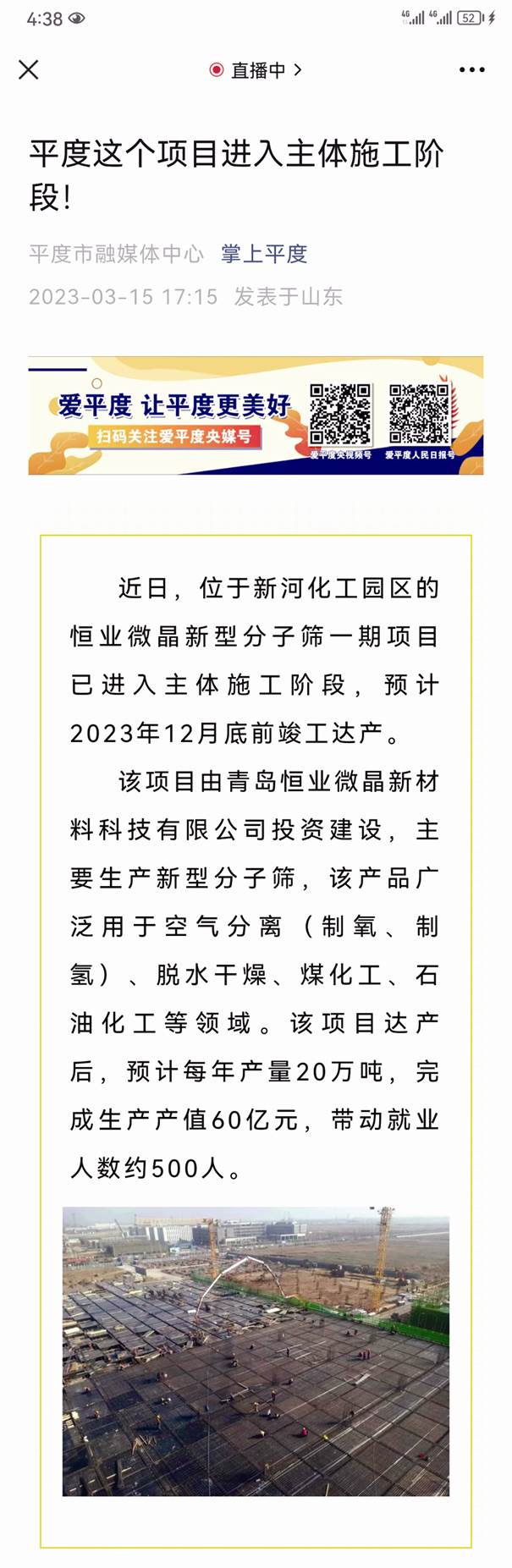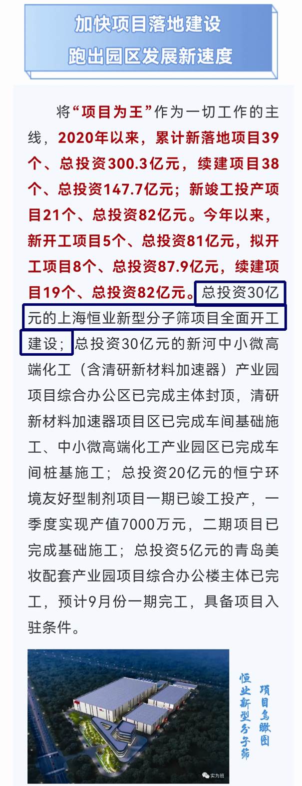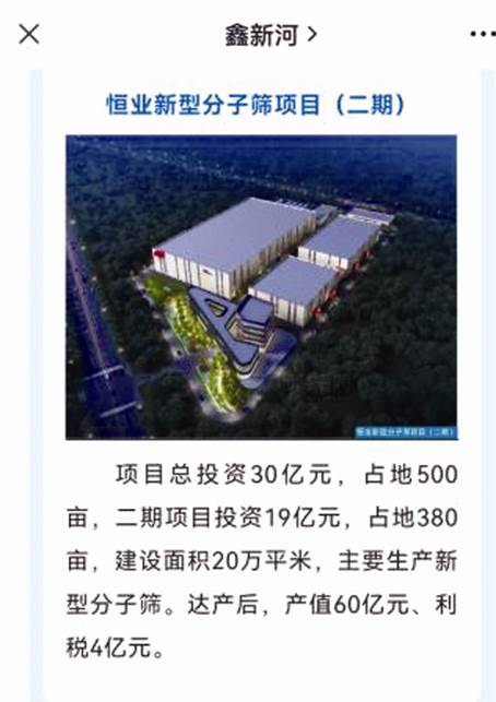 該文稱:“近日,位于新河化工園區的恒業微晶新型分子篩一期項目已進入主體施工階段,預計2023年12月底前竣工達產。該項目由青島恒業微晶新材料科技有限公司投資建設,主要生產新型分子篩,該產品廣泛用于空氣分離(制氧、制氫)、脫水干燥、煤化工、石油化工等領域。該項目達產后,預計每年產量20萬噸,完成生產產值60億元,帶動就業人數約500人。”并且,該文配有一張工程施工實景圖片。