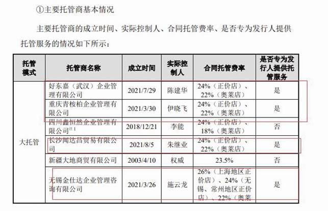 除了本報曾報道的迪柯尼,在報告期門店銳減的情況下又擬募資成倍擴充門店,與競爭對手共用一個供應商,且該供應商還是競爭對手的關聯方等問題外,《大眾證券報》明鏡財經工作室記者還注意到,在報告期,迪柯尼對一些直營門店采取了“大托管”的模式,而幾家托管商實控人是公司前員工離職后創立。而且采取大托管模式后,相關門店凈利潤普遍下降,費用支出上升,大托管模式的合理性問題同樣惹人矚目。