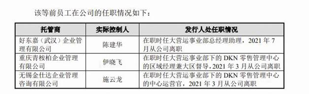 其中,好東嘉的實控人陳建華為2021年7月從迪柯尼離職的大營運事業部總經理助理、重慶青桉柏伊曉飛為2021年3月從公司辭職的大營運事業部下DKN零售管理中心的區域經理兼大區督導,無錫金仕達的實控人施云龍曾為DKN零售管理中心運營官,其2021年3月從公司離職(見圖三)。而其中陳建華更是在2020年12月才剛剛入職迪柯尼,次年7月即離職,在迪柯尼甚至領薪都未滿一個完整年度。