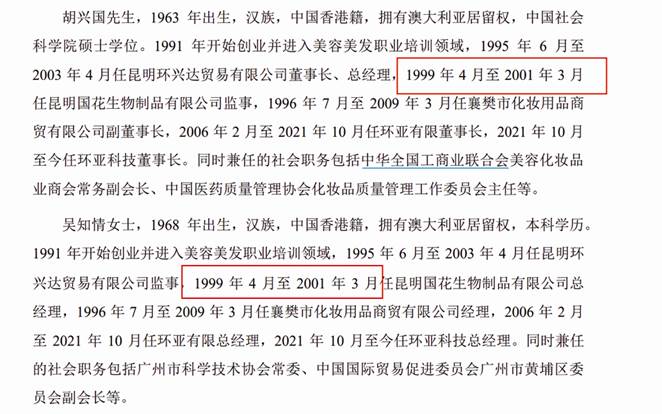 可以說(shuō),環(huán)亞科技的發(fā)展過(guò)程貫穿著胡興國(guó)、吳知情兩人的共同奮斗,夫妻兩人的履職單位也保持著“綁定”的狀態(tài)。招股書(shū)披露,胡興國(guó)1991年開(kāi)始創(chuàng)業(yè)并進(jìn)入美容美發(fā)職業(yè)培訓(xùn)領(lǐng)域,吳知情也是同一時(shí)間開(kāi)始創(chuàng)業(yè)并步入該領(lǐng)域,1995年6月至2003年4月,胡興國(guó)任昆明環(huán)興達(dá)貿(mào)易有限公司董事長(zhǎng)、總經(jīng)理,同一時(shí)段,吳知情任昆明環(huán)興達(dá)貿(mào)易有限公司監(jiān)事。1999年4月至2001 年3月,胡興國(guó)任昆明國(guó)花生物的監(jiān)事,其妻子吳知情在該時(shí)間段任昆明國(guó)花生物總經(jīng)理。