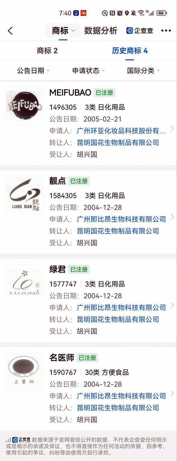 此外,招股書(shū)披露的子公司廣州那比昂持有的商標(biāo)中,為何沒(méi)有由昆明國(guó)花生物轉(zhuǎn)讓給胡興國(guó),此后又從胡興國(guó)處受讓的“靚點(diǎn)”“綠君”和“名醫(yī)師”等三個(gè)商標(biāo)?