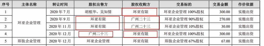 而2020年7月-11月,環(huán)亞有限自胡根華、吳知情收購(gòu)環(huán)亞企業(yè)管理100%股權(quán)后,轉(zhuǎn)讓至廣州二十三。2020年12月,又將環(huán)亞企業(yè)管理由廣州二十三轉(zhuǎn)讓至環(huán)亞有限(見(jiàn)圖四),而環(huán)亞有限、環(huán)亞企業(yè)管理及廣州二十三均為實(shí)際控制人100%控制企業(yè)。企查查顯示,廣州二十三在2019年9月成立,2021年3月決議解散,2021年4月注銷。