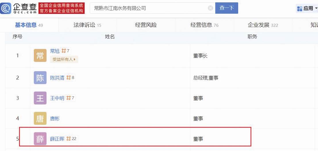 同時在大客戶任職的中法水務董監高并非金科一人。企查查顯示,中法水務董事薛正暉同時擔任常熟江南水務董事(見圖二),且為保障房公司現任監事(見圖三);此外,其還在控股股東城建公司擔任監事主席(見圖四)。
