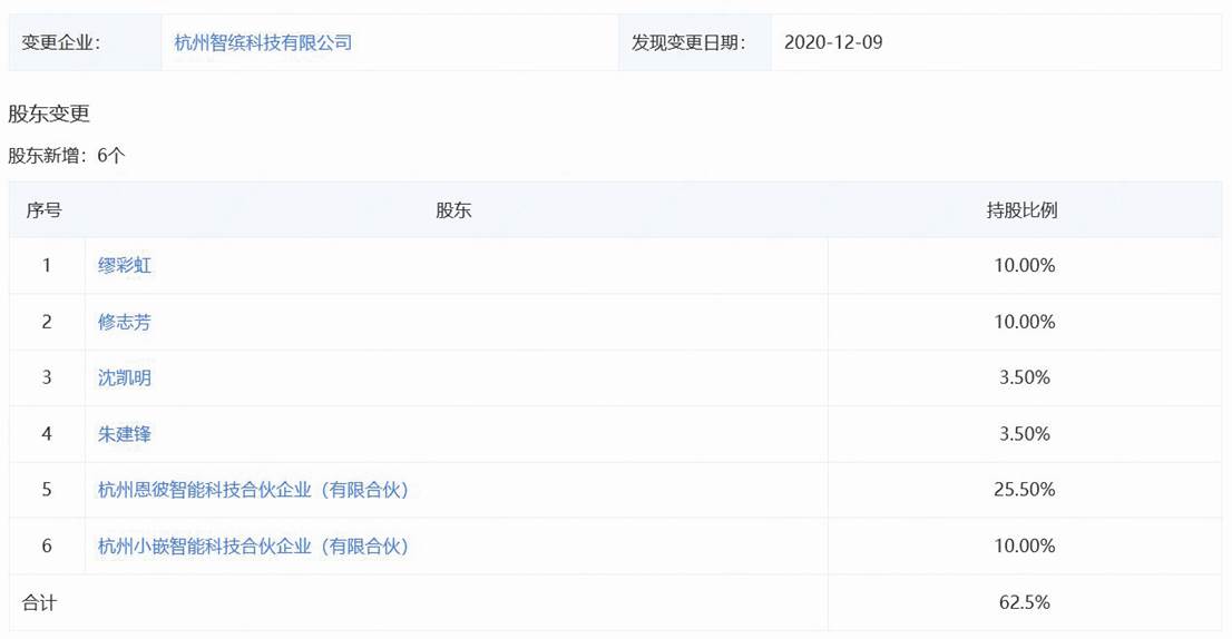 圖一:杭州智繽科技有限公司2020年12月新增6名股東