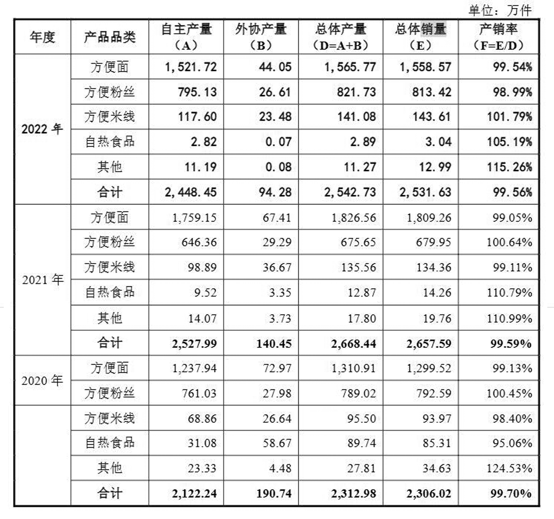 該項(xiàng)目計(jì)劃建設(shè)期為24個(gè)月,建成投產(chǎn)后,達(dá)產(chǎn)年預(yù)計(jì)可使方便面、方便粉絲、方便米線的產(chǎn)能分別新增1200.00萬件/年、864.00萬件/年、199.20萬件/年。結(jié)合阿寬食品報(bào)告期內(nèi)產(chǎn)能來看,2020-2022年,公司自主產(chǎn)能依次為2222.70萬件/年、2445.73萬件/年、2317.99萬件/年,意味著阿寬食品此次募投項(xiàng)目達(dá)產(chǎn)后將擴(kuò)產(chǎn)產(chǎn)能近100%。