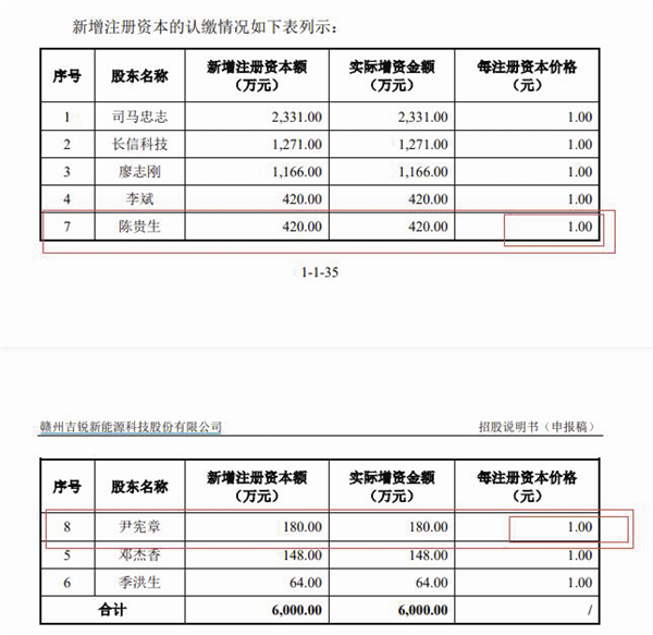后因股東蔡昶放棄認繳新增注冊資本600萬元,于是陳貴生、尹憲章認繳蔡昶放棄的新增注冊資本,其中陳貴生認繳 420萬元,尹憲章認繳180萬元(后將持股平移至實控人控制的持股平臺贛州銳展)。兩人的增資入股價與吉銳有限其他股東相同,都是1元/注冊資本。