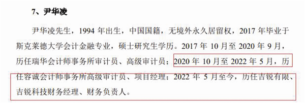從披露的尹華凌簡歷看,1994年出生,2017年10月至2020年9月,歷任瑞華會計師事務所審計員、高級審計員;2020年10月至2022年5月,歷任容誠會計師事務所高級審計員、項目經理;2022年5月至今,歷任吉銳有限、吉銳科技財務經理、財務負責人(見圖二)。
