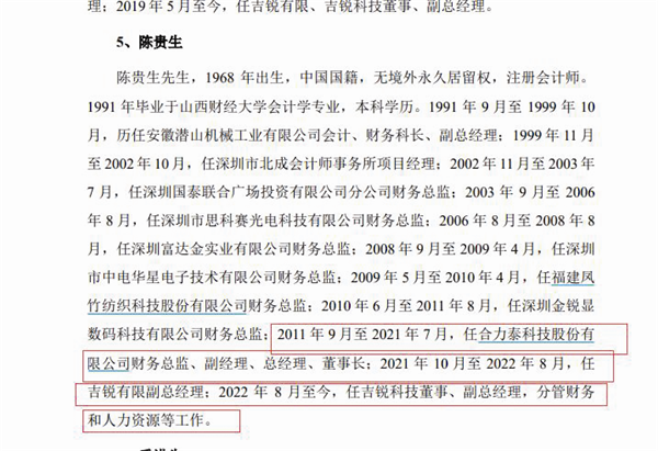 公司披露的陳貴生簡歷顯示,2011年9月至2021年7月,任合力泰科技股份有限公司財務總監、副經理、總經理、董事長;2021年10月至2022年8月,任吉銳有限副總經理;2022年8月至今,任吉銳科技董事、副總經理,分管財務和人力資源等工作(見圖三)。