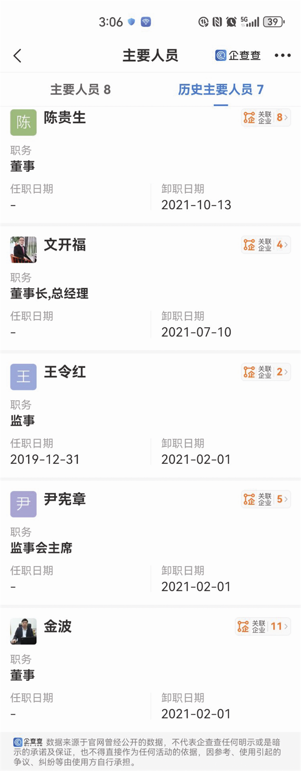 進一步查詢顯示,尹憲章還曾是江西合力泰科技有限公司的監事會主席,工商登記信息顯示2021年2月1日卸職,并曾在2008年10月至2014年3月是該企業股東。而該企業是陳貴生曾任職的合力泰控股子公司,陳貴生在其任董事,工商登記信息顯示2021年10月13日卸職(見圖四)。