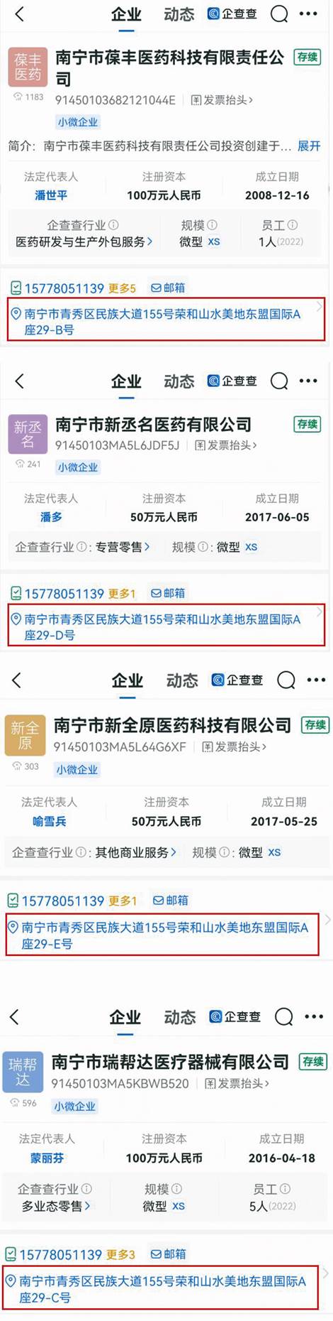 2008年12月成立的南寧市葆豐醫(yī)藥科技有限責(zé)任公司(以下簡稱“南寧葆豐”),潘世平、喻瓊分別持股60%、40%;其中,潘世平2019年10月18日進(jìn)入后持股100%,2023年8月23日喻瓊受讓潘世平40%持股。該企業(yè)2020年年報(bào)顯示,聯(lián)系電話0771-5766255與海南全原2015年年報(bào)相同;2022年年報(bào)則顯示,聯(lián)系電話15778051139又與南寧市新全原醫(yī)藥科技有限公司(2017年5月成立,以下簡稱“南寧新全原”)、南寧市新丞名醫(yī)藥有限公司(2017年6月成立,以下簡稱“南寧新丞名”)、南寧市瑞幫達(dá)醫(yī)療器械有限公司(2016年4月成立,以下簡稱“南寧瑞幫達(dá)”)相同(見圖二)。