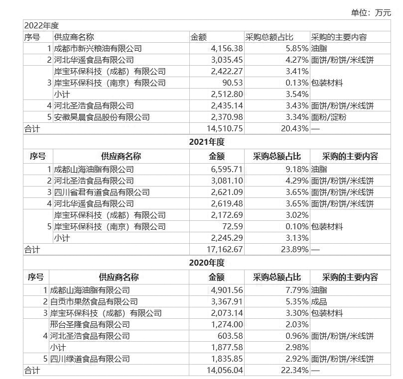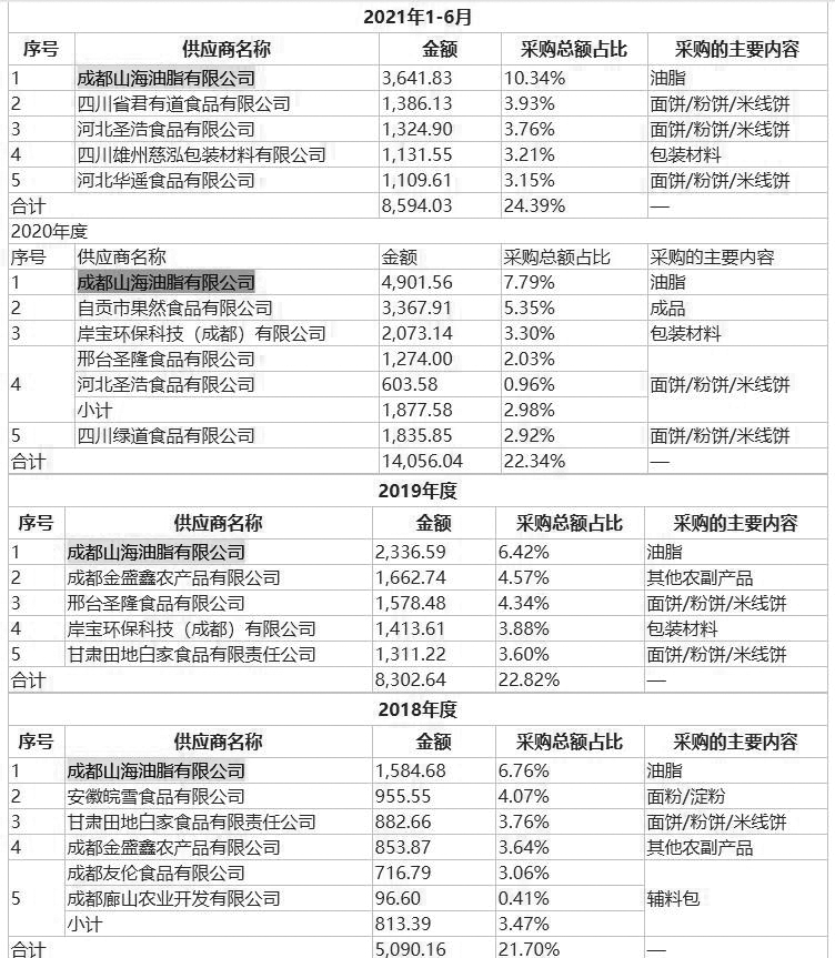 2023年3月披露的招股書顯示,2022年上半年,阿寬食品向成都市新興糧油有限公司、成都山海油脂有限公司采購(gòu)油脂金額分別為1490.96萬(wàn)元、2225.34萬(wàn)元。其中,2022年上半年,阿寬食品向成都山海油脂有限公司采購(gòu)油脂金額遠(yuǎn)低于2021年上半年的金額3641.83萬(wàn)元。